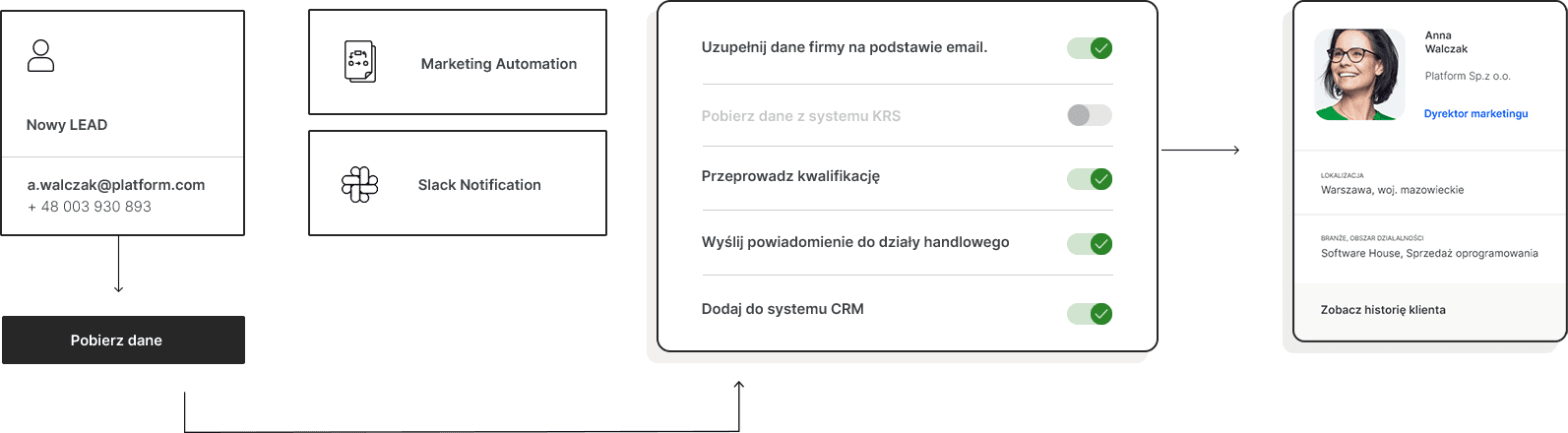 Automatyzacja uzupełni informacje o branży klienta, obrotach, wielkości firmy. Na podstawie danych sprzedażowych dopasuje produkt lub usługę, którą potencjalnie może być zainteresowany klient. Handlowiec otrzyma gotowe rekomendacje a marketing informacje przydatne do kampanii.