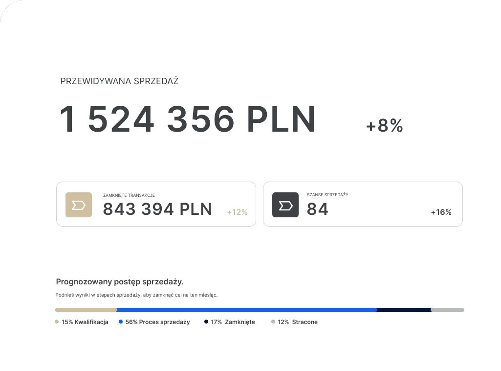 Widzisz prognozę sprzedaży i szanse podpisania umów. Wiesz, którzy klienci podpiszą umowę, na jaką kwotę oraz w jakim czasie. Dobrze ułożona sprzedaż ma charakter powtarzalny, widzisz ile transakcji ma szanse wygranej i w jakim czasie. Możesz planować działania sprzedażowe, aby zwiększyć szanse powodzenia.