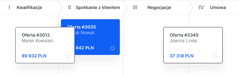 Działania sprzedażowe przedstawione są jako prosty proces, z jasno określonymi etapami i zadaniami. Proces jest dokładnie mierzony i daje odpowiedź na którym etapie nie udało się zamknąć sprzedaży i co należy poprawić.